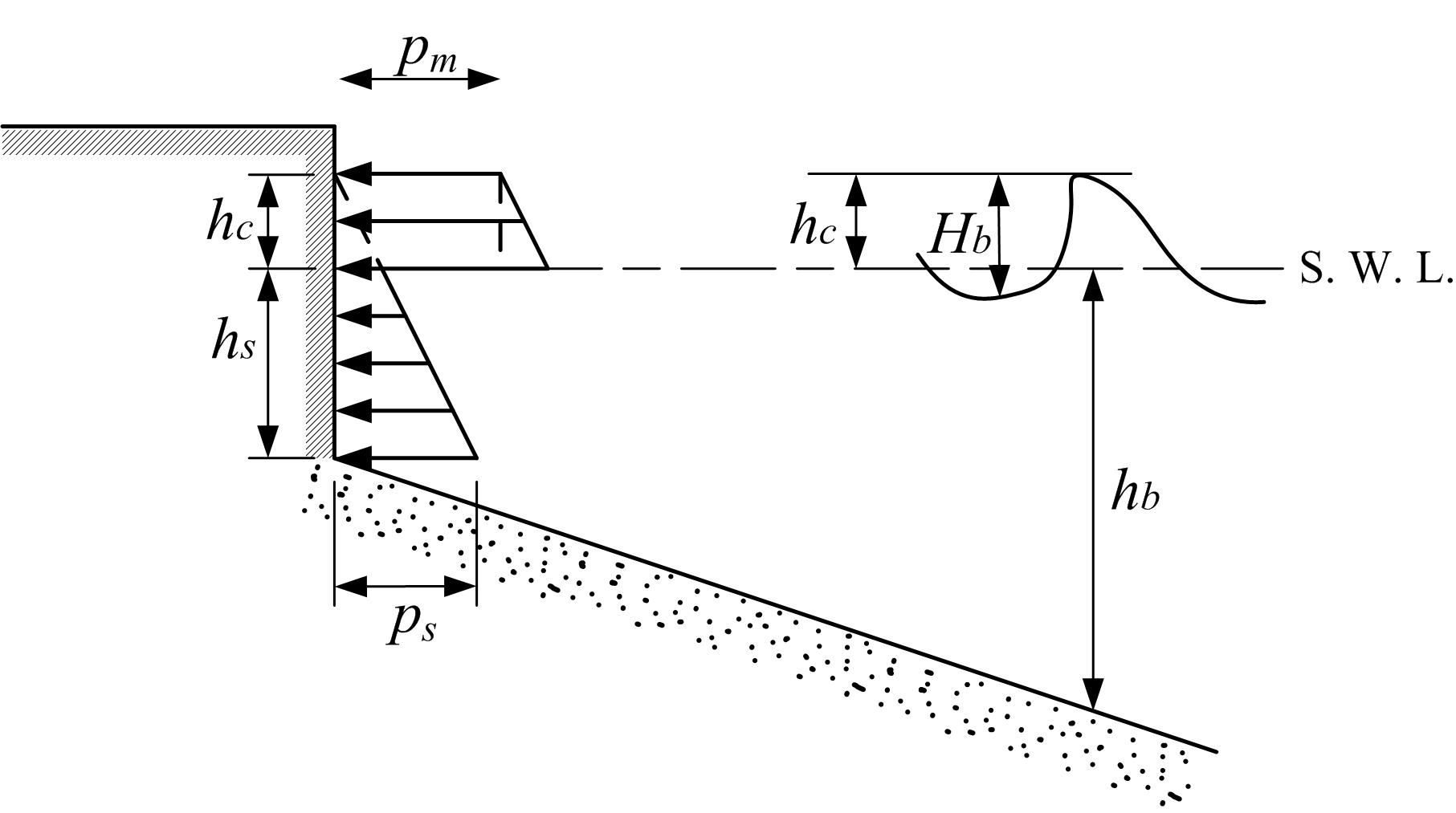 如圖,直立壁位於岸線海側,波浪到達壁前已碎波時,作用於直立壁作用力,依美國